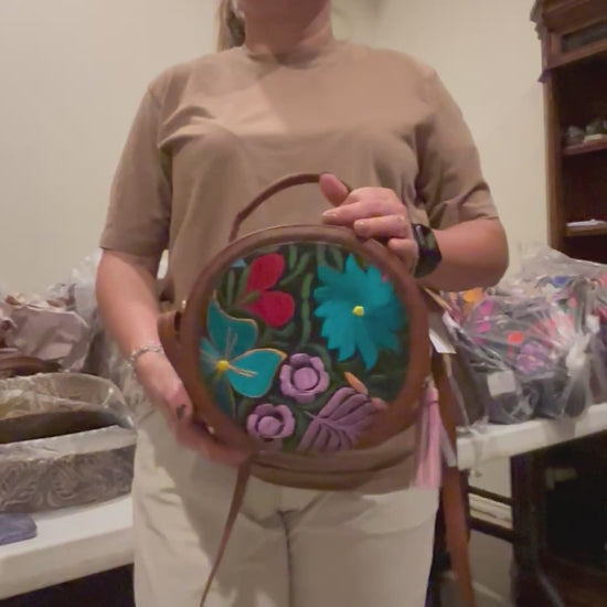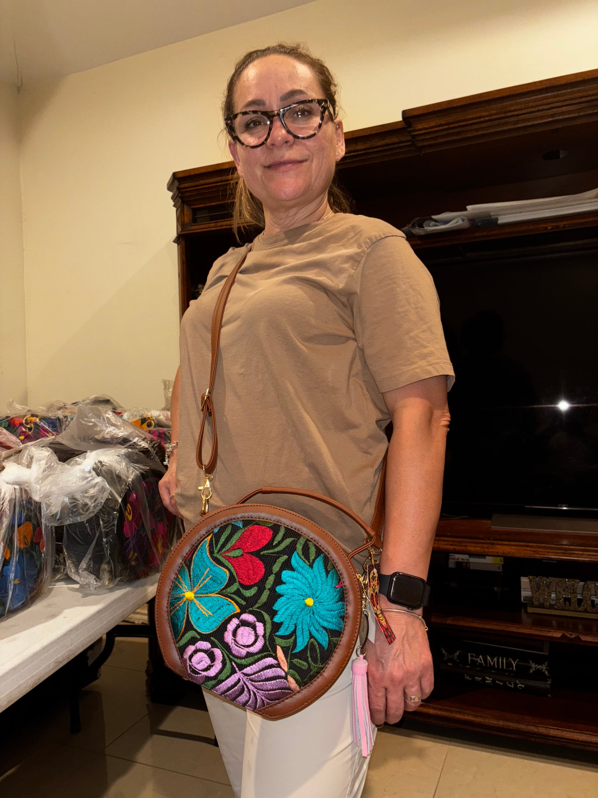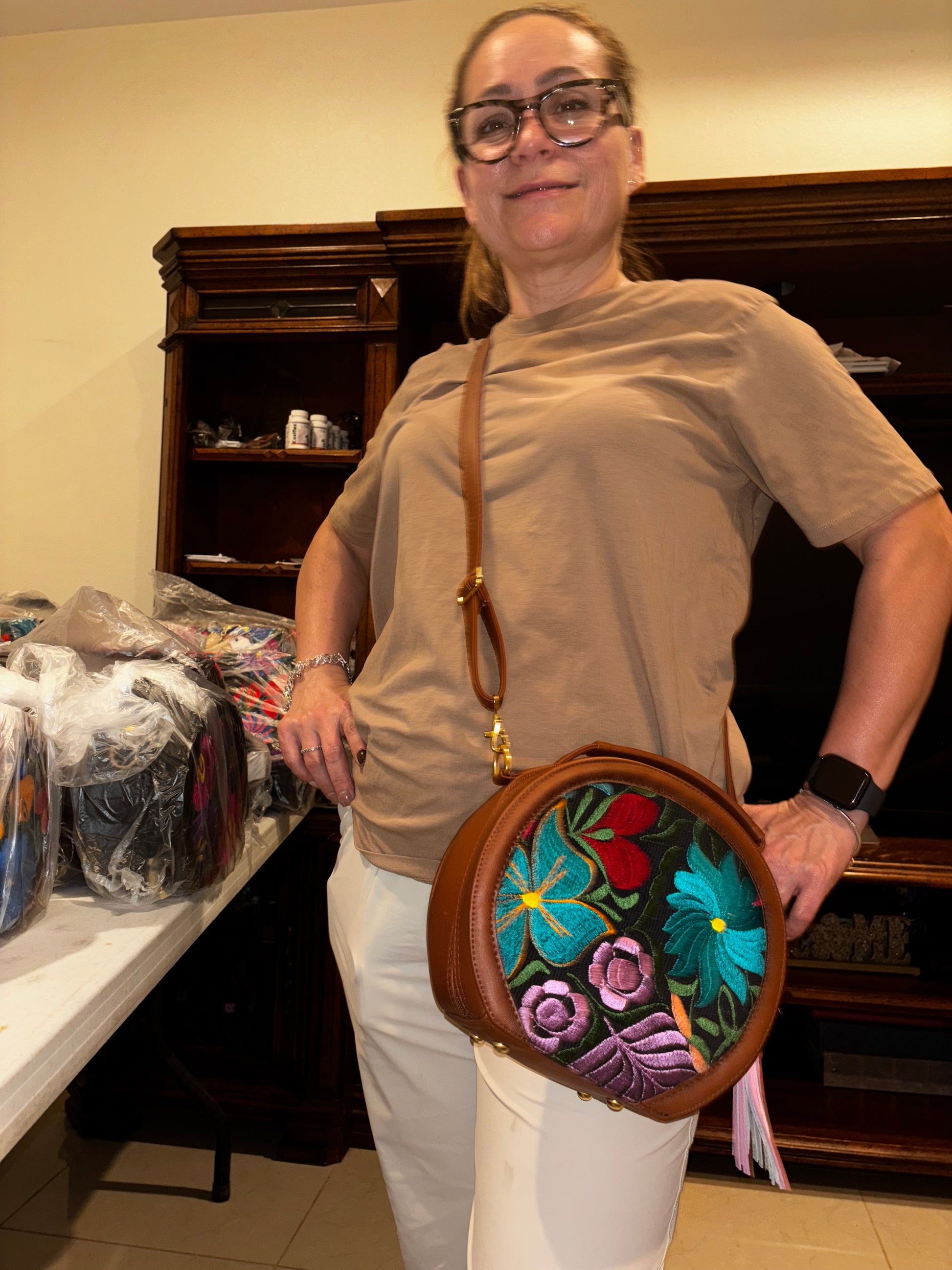 Bolsa Circular Artesanal de Yute y Cuero Vegano – Bordado Mexicano